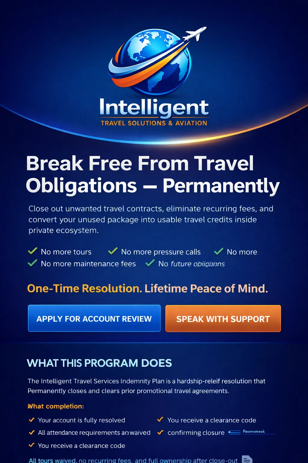 The Intelligent Travel Services Indemnity Plan is a hardship-relief resolution that permanently closes and clears prior promotional travel agreements.